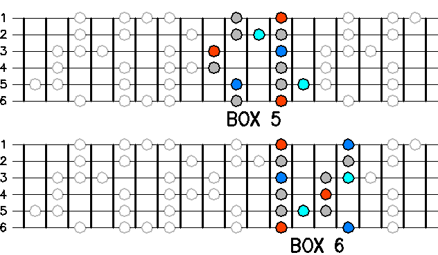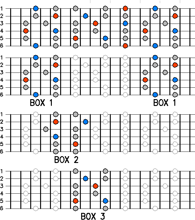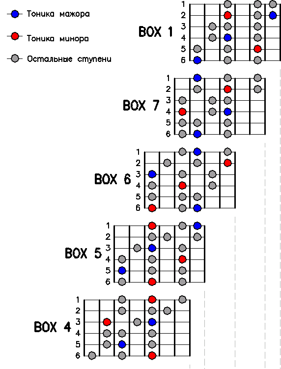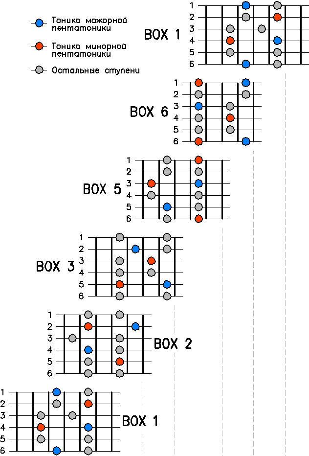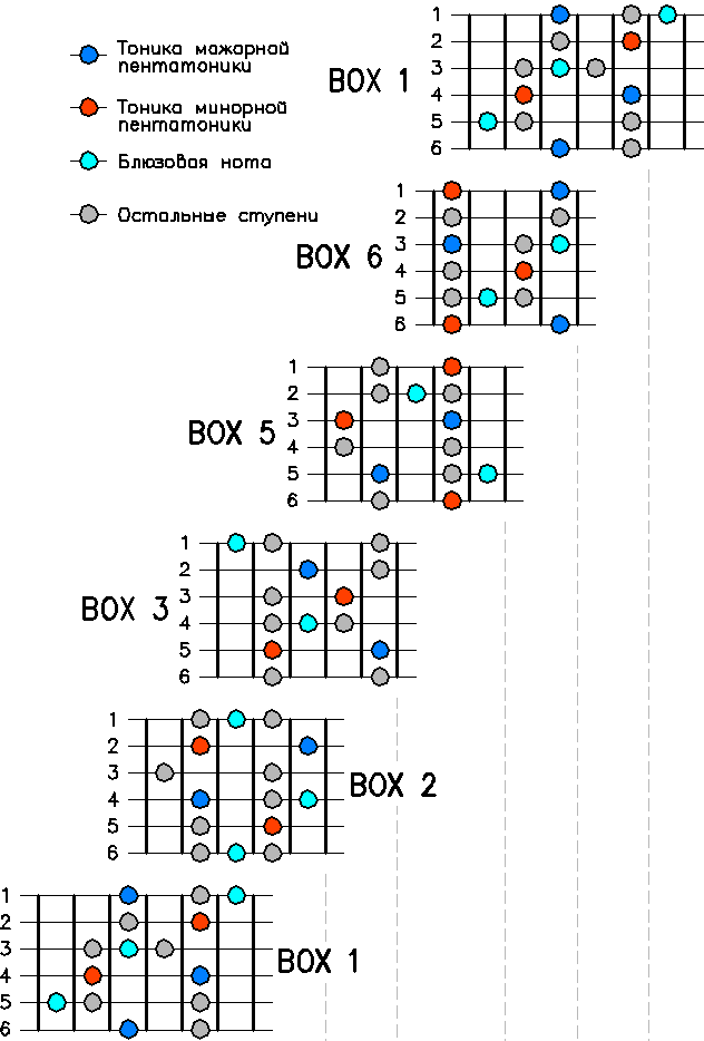 Боксов пентатоники пять типов, но пронумерованы они в соответствии с боксами натурального мажорного лада, а точнее, как и боксы натурального мажорного лада, в соответствии со ступенями натурального мажора, поэтому в пентатонике нет BOX_4 и BOX_7, как нет в мажорной пентатонике IV и VII ступеней относительно натурального мажорного лада. Такая нумерация удобна для запоминания аппликатур, а в игре - для перехода из бокса пентатоники в бокс натурального мажора и обратно. Для запоминания боксов пентатоники удобно пользоваться октавными позициями (см. раздел Интервалы). На примере боксов пентатоники октавные позиции просматриваются лучше всего, более того, октавные позиции получили свои номера от боксов пентатоники. Боксы пентатоники с блюзовой нотой. Пентатоника с блюзовой нотой - это пентатоника, в которой присутствует хроматическая