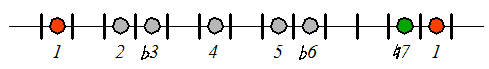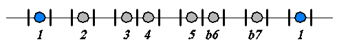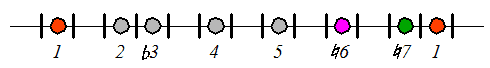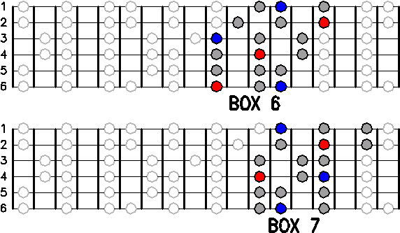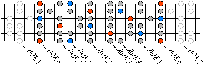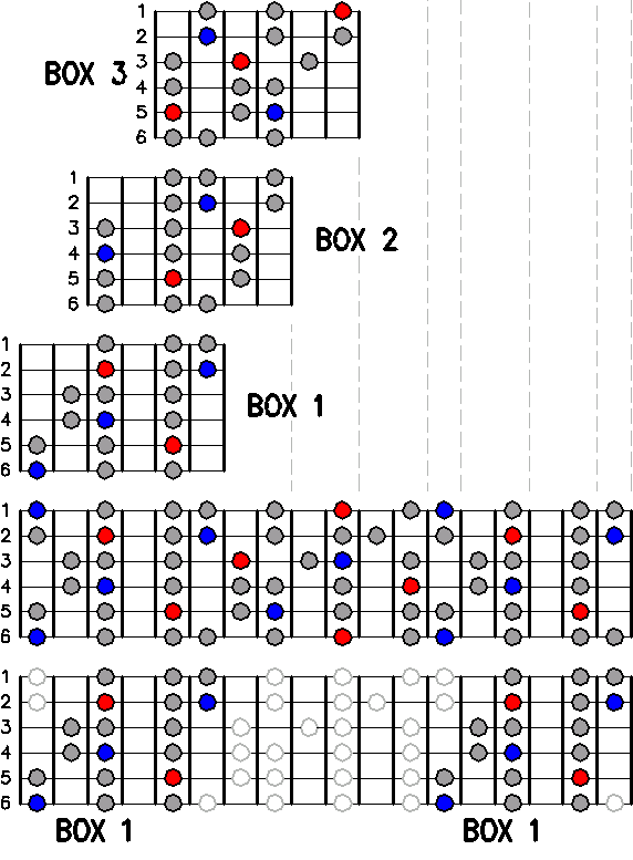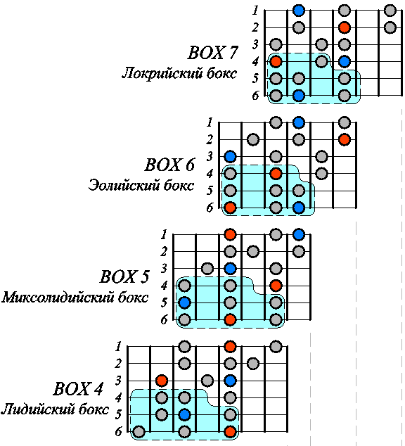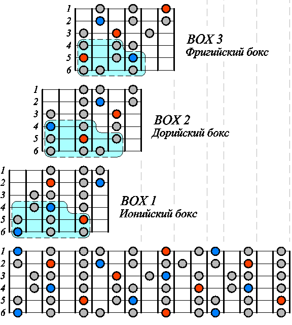 Стоит обратить внимание, что для перехода из мажора в параллельный минор и наоборот, боксы не перемещаются (расположение структуры на грифе одинаковое), изменяется акцент - или "синяя" нота (тоника мажора), или "красная" (тоника минора). Нумерация боксов - понятие довольно условное, и она необходима на первых порах изучения и запоминания. Здесь важна структура. Когда эти аппликатуры будут "в памяти" Ваших пальцев, Вы не будете думать, а в каком же боксе я играю, тем более что в игре, в импровизации, Вы ни как не ограничитесь одним боксом, а, играя вдоль всего грифа, будете постоянно переходить из одного бокса в другой. Поэтому изучая боксы, уделите особое внимание именно переходам из бокса в бокс. Удобно ассоциировать боксы с диатоническими ладами, построенными от 6-ой струны. Так, BOX_1 можно называть ионийским боксом, так как если принять за тонику его первую ноту на 6-ой струне, то получится ионийский лад. Аналогичным образом: BOX_2 - дорийский бокс, BOX_3 - фригийский бокс, BOX_4 - лидийский бокс, BOX_5 - миксолидийский бокс, BOX_6 - эолийский бокс, BOX_7 - локрийский бокс. Более наглядно это можно проиллюстрировать на следующем аппликатурно-схематическом примере: