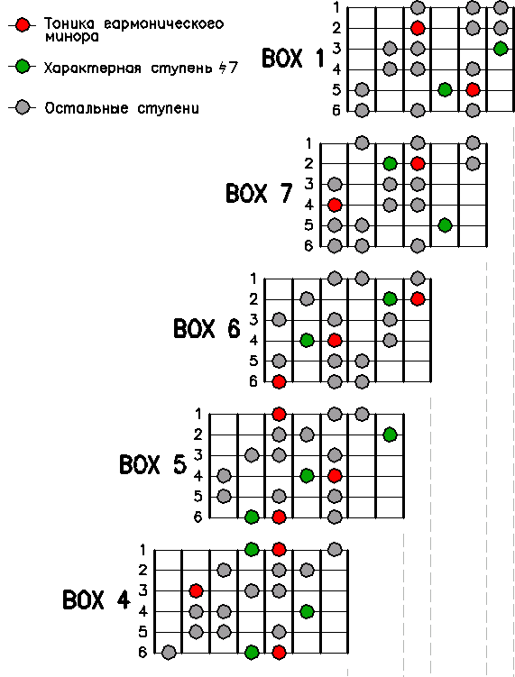 Боксы, построенные на мажорном звукоряде и пентатонике, обязательны для изучения. Боксы пентатоники запоминать лучше сразу с блюзовой нотой. Работать с боксами можно следующим образом: играйте их, начиная снизу или сверху четвертыми нотами, потом восьмыми, шестнадцатыми, триолями и т.д., также играйте секвенции, состоящие из групп по две, три, четыре ноты и т.д., отрабатывайте скольжения при переходе из одного бокса в другой, и т.д., придумывайте свои упражнения. Все упражнения выполняются строго под метроном! Боксы для гармонического и мелодического миноров (приводятся ниже), в принципе, заучивать не обязательно, однако, в качестве упражнений они годятся для отработки нестандартных растяжек пальцев (в гармоническом миноре присутствует М3 - малая терция), приемов hammer-on и pull-off, игры секвенций. Боксы гармонического минора. Ниже будут приведены боксы гармонического и мелодического миноров, названых по номеру ступени, от которых они построены. Поэтому для перехода из этих ладов в натуральный мажор (с той же тоникой), нужно учитывать различия в формуле гармонического и мелодического миноров от формулы натурального мажорного лада (см. "Условно-диатонические лады"). Гармонический минор имеет следующую аппликатурную схему (с движением по одной струне):