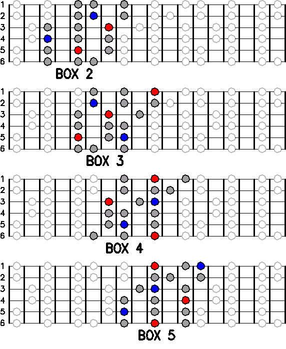 Ниже приведены боксы пентатоники с блюзовой нотой: