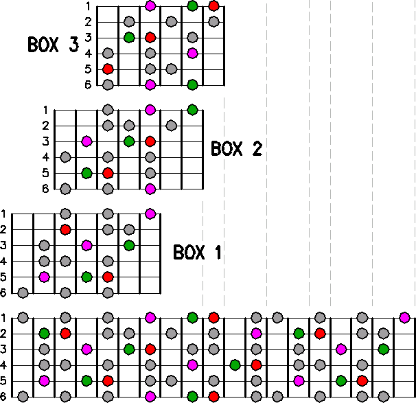 Если нанести все ноты натурального мажора на гриф гитары, мы получим семь боксов, которые позволят играть данный звукоряд, а также параллельный ему натуральный минорный, в разных частях грифа.