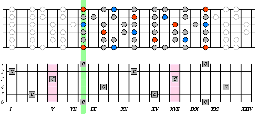 На рисунке выше номер бокса соответствует номеру ступени, от которой он строится. Синим цветом ( Боксы пронумерованы в соответствии со ступенями натурального мажорного лада, т.е. номер бокса - это та ступень натурального мажорного лада, которая "оказалась" первой нотой бокса на шестой струне. Структура боксов в рамках одной гаммы одинакова в независимости от тональности, а изменение тональности приводит просто к перемещению этой структуры (боксов) вдоль грифа. Ниже приведен пример, на котором показано, как определить положение боксов натуральной мажорной гаммы (и, соответственно, параллельной минорной) для той или иной тональности (в приведенных примерах для С-мажор, G-мажор и С-минор, G-минор).