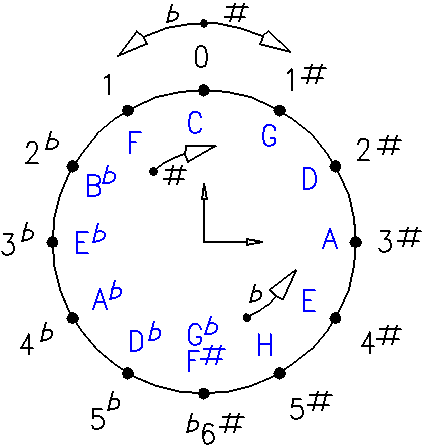С помощью квинтового круга можно легко определить, сколько диезов или бемолей в той или иной мажорной тональности (и соответственно в параллельной минорной), либо по количеству диезов или бемолей - тональность. Скажем, вы играете гамму А-мажор, то, взглянув на квинтовый круг, видно, что в этой тональности 3 диеза, т.е. эта тональность включает в себя следующие ноты: