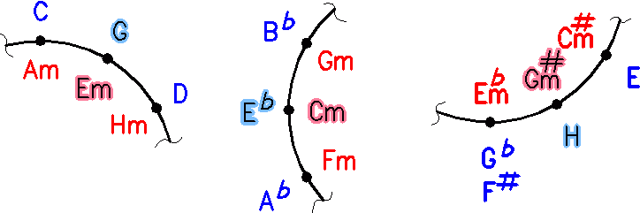 Квинтовый круг... Квинтовый круг (кварто-квинтовый круг тональностей) - это схематическое, наглядное изображение (чаще всего в виде окружности) последовательности тональностей, отражающее степень их родства, ладовую функцию, гармонические обороты. На внешней стороне квинтового круга расположены мажорные тональности, параллельные минорные тональности (на малую терцию ниже) - на внутренней. На квинтовом круге тональностей (или кварто-квинтовом круге) основаны стандартные последовательности аккордов. Выбрав на внешней стороне круга любой аккорд и приняв его за тонику, легко узнать, какие еще аккорды входят в выбранную тональность.