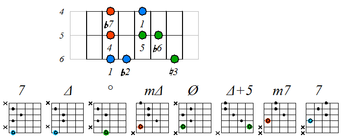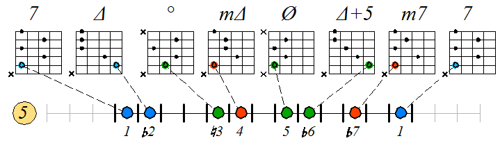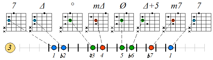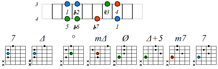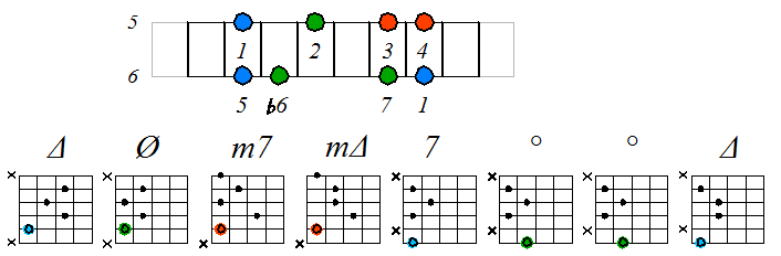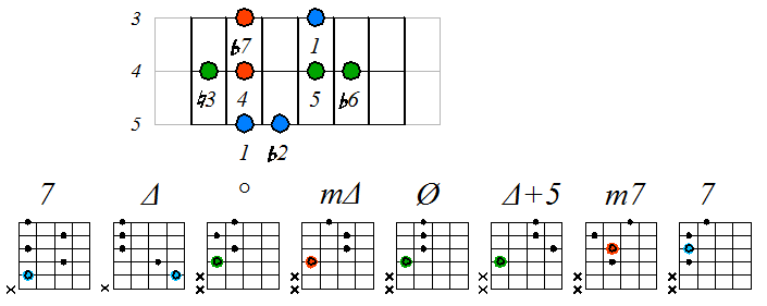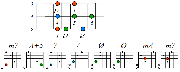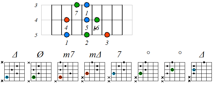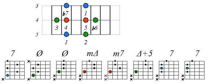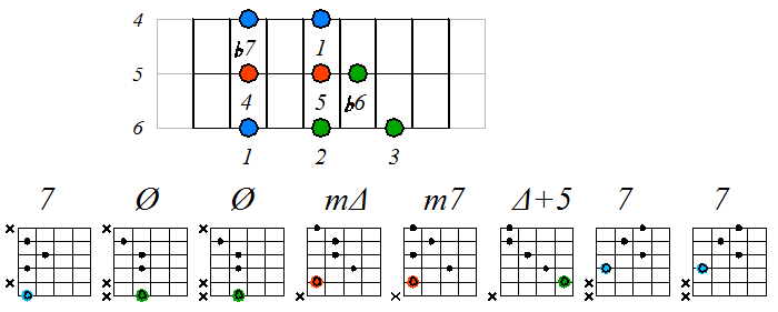 Как видно, на каждой струне играются по четыре септаккорда, а перход на нижнюю струну происходит с пятой ступени гаммы. Эти два правила будут справедливы и далее. Приведенные выше примеры обыгрывания гамм, следует проработать во всех тональностях с использованием различных вариантов аппликатур аккордов. Ниже будут приведены варианты игры септаккордами, построенными на ступенях условно-диатонических ладов. Натуральный минор На ступенях гаммы строятся следующие септаккорды: