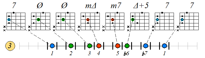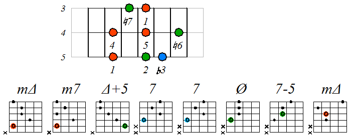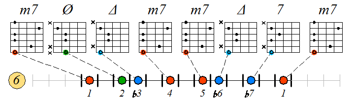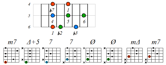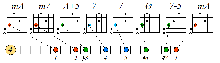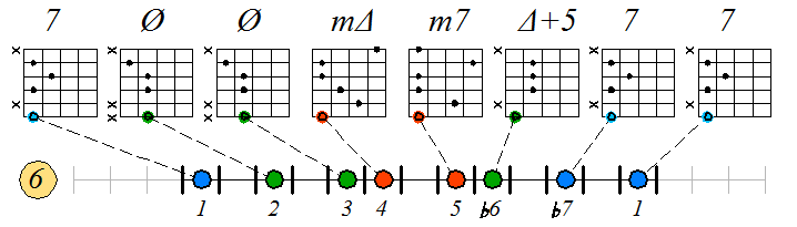 Ниже приведен пример игры гаммы мелодического минора септаккордами с движением нижних тонических нот по 6 струне с переходом на 5 и 4: