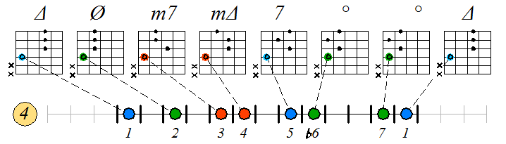 Игра натурального мажора септаккордами с движением нижних тонических нот по 4-ой струне: