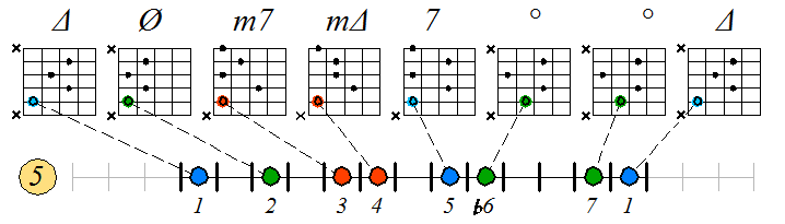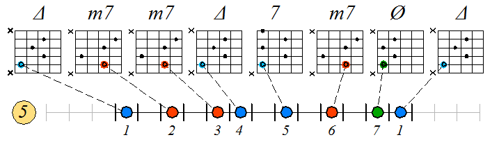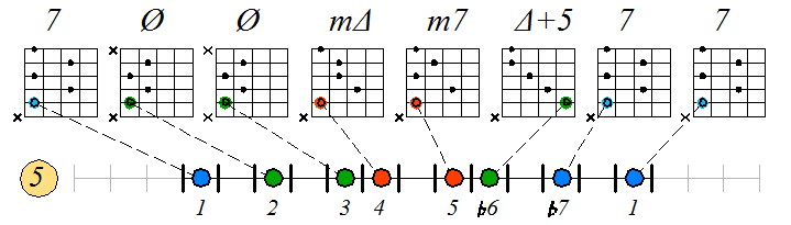 Игра натурального мажора септаккордами с движением нижних тонических нот по 5-ой струне: