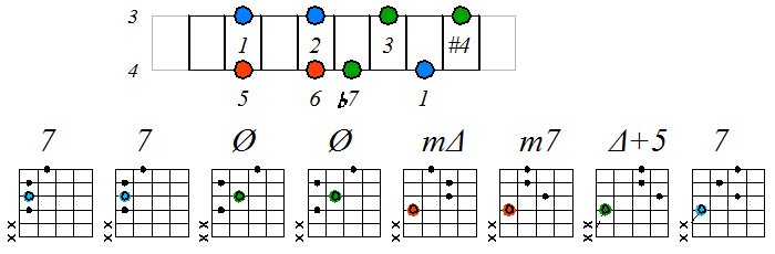 Игра гаммы лидийско-миксолидийского мажора септаккордами с движением тонических нот по 3 струне: