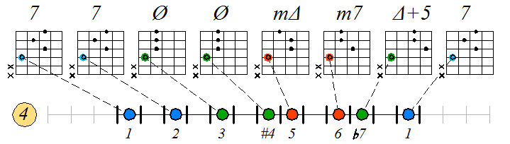 Игра гаммы лидийско-миксолидийского мажора септаккордами с движением тонических нот по 6 струне с переходом на 5 и 4 (альтернативная аппликатура гаммы):