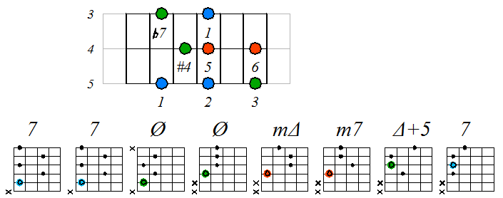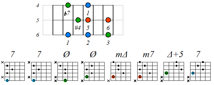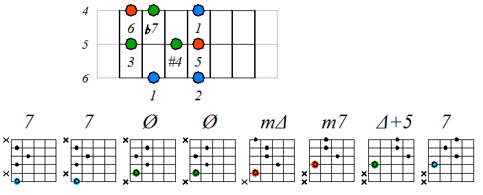 Лидийско-миксолидийский мажор На ступенях гаммы строятся следующие септаккорды: