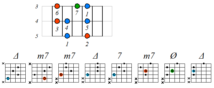 Игра гамм септаккордами... Игра гамм септаккордами выполняет как теоретическую, так и практическую функции. С одной стороны, играя гаммы как упражнения, осваиваются гармонические последовательности аккордов, с другой - эти же упражнения вполне употребимы на практике. Все приведенные в этом разделе схемы не увязаны к определенным тональностям. Для обыгрывания аккордами любой гаммы важно хорошо представлять ее аппликатурную структуру, уметь играть ее от любой ноты (это определит тональность) и помнить, какие аккорды строятся от каждой ступени. Кроме того, изучая схемы аккордов важно запоминать расположение первой ступени аккорда - это позволит быстро выбирать нужную схему. Натуральный мажор На ступенях натуральной мажорной гаммы можно построить следующие септаккорды: