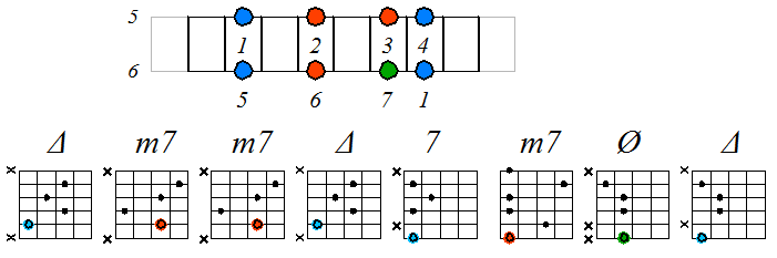 Ниже приведен пример игры натурального мажора септаккордами с движением нижних тонических нот по 6-ой струне с переходом на 5-ую и 4-ую. Для игры по этой схеме нужно хорошо представлять аппликатуру натурального мажора по схеме 3 ноты на струне. В принципе, переходить на 4-ую струну не обязательно, а можно продолжить игру на пятой струне, однако, находясь в высокой части грифа (за 12-ым ладом), бывает удобней взять аккорд с тоникой на 4-ой, а не на 5-ой струне.