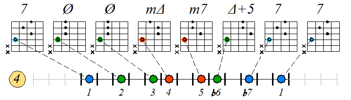 Ниже приведен пример игры гаммы гармонического минора септаккордами с движением нижних тонических нот по 6 струны с переходом на 5 и 4: