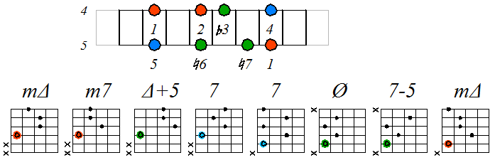 Игра гаммы мелодического минора септаккордами с движением нижних тонических нот по 5 струне: