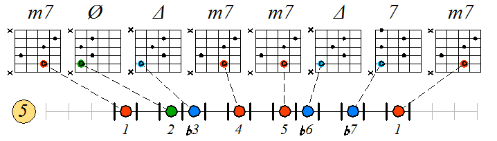 Игра гаммы дорийско-фригийского минора септаккордами с движением тонических нот по 5 струне с переходом на 4 и 3: