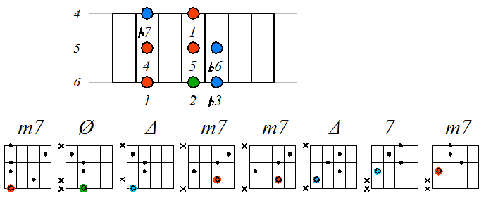 Ниже приведен пример игры натурального минора септаккордами с движением нижних тонических нот по 6 струне с переходом на 5 и 4: