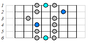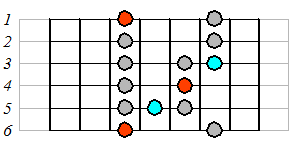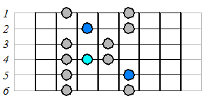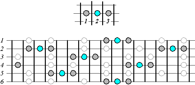 Блюзовая нота - это вводный тон ко второй или третей ступени в мажорной пентатонике (или к четвертой или пятой в минорной). В аппликатурах для игры в одной позиции на всех шести струнах, в том числе и в боксах, наибольший интерес представляют те участки аппликатуры, в которых блюзовая нота оказывается на одной струне с соседними ступенями. Тогда эти три ноты играются пальцовкой 1-2-3: