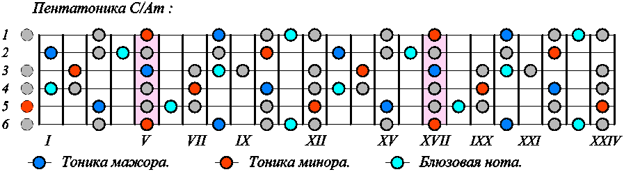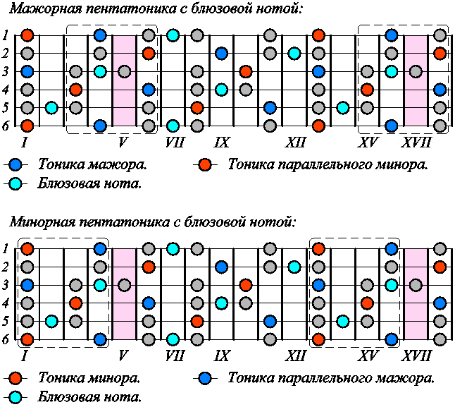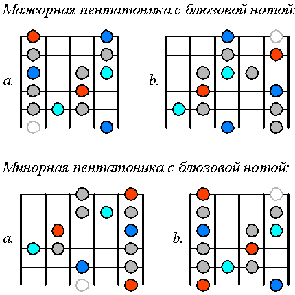 Приведем аппликатуры мажорной и минорной пентатоник в каждой октавной позиции (схемы сразу с блюзовой нотой):