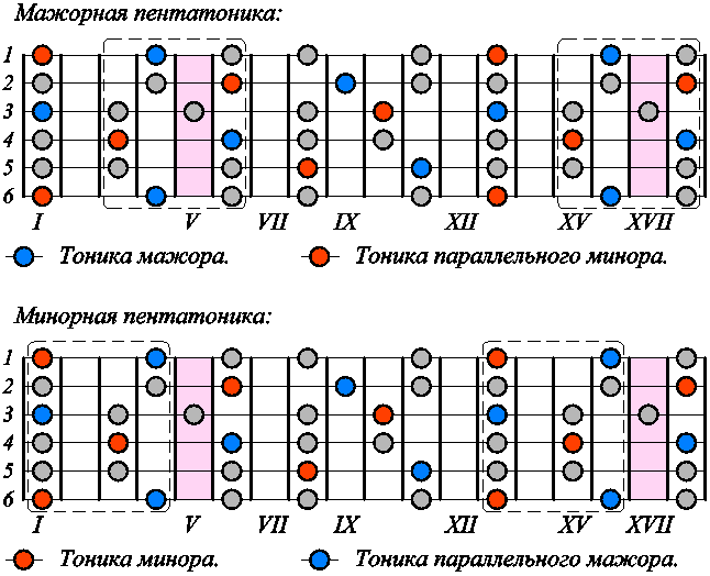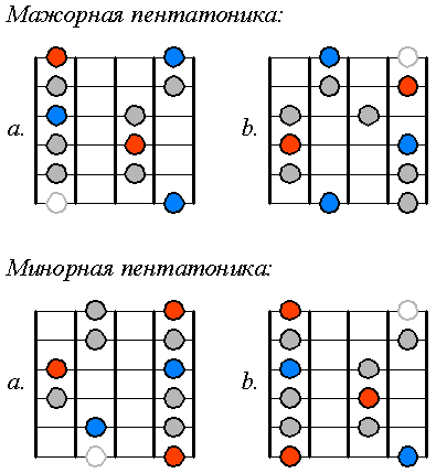 Ниже приведены по 2-е аппликатуры мажорной и минорной пентатоник на грифе гитары (данные аппликатурные формы не учитывают смещение на 1/2 тона на верхних струнах, т.е. на 1-ой и 2-ой) для игры в одной позиции: