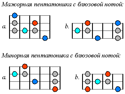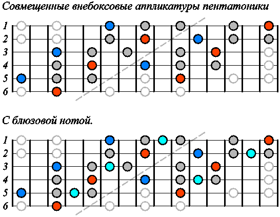 В блюзе на мажорную гармонию часто играется минорная пентатоника, отсюда в мажорном звукоряде и появляются эти "голубые" ноты. Пентатонику с блюзовой нотой также можно представить в виде боксов. Ниже приведены довольно часто используемые внебоксовые аппликатуры пентатоники в чистом виде и с блюзовой