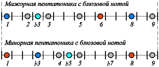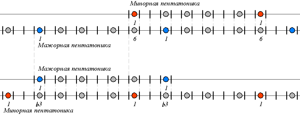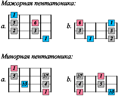 Таким образом, мы имеем следующие формулы мажорной и минорной пентатоник: