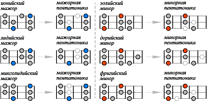 Кроме того, если из любого мажорного диатонического лада исключить 4-ую и 7-ую ступени, а из минорного 2-ую и 6-ую, то мы также получим соответственно мажорную и минорную пентатоники: