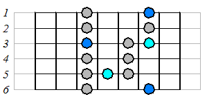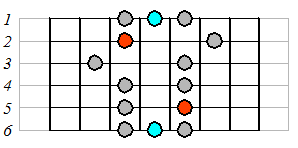Обратите внимание на положение тоники параллельной мажорной пентатоники в минорной - здесь учень удобно, пользуясь системой октав, проецировать на гриф совмещенную аппликатуру параллельных пентатоник. Не смотря на то, что пентатоника - достаточно простая гамма, в которой в пределах октавы всего пять нот, данная совмещенная схема помогает лучше ориентироваться на грифе: