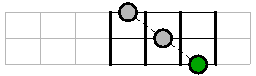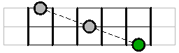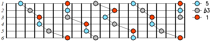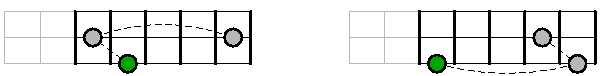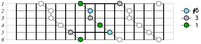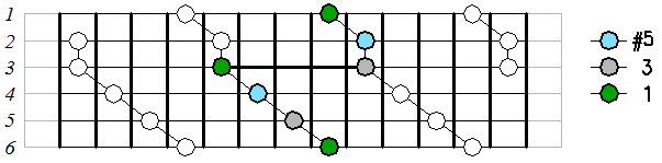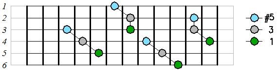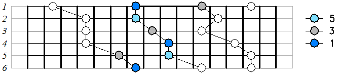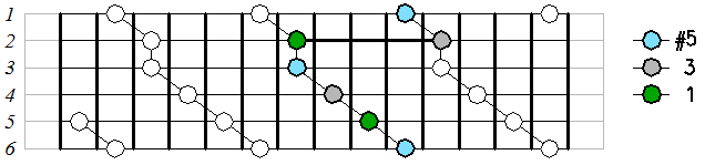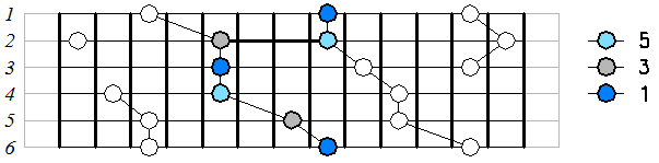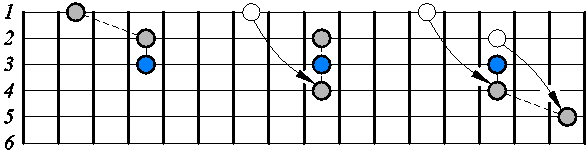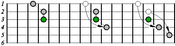 Кроме того, смещать аппликатуры можно и не задерживаясь в рамках одной октавной позиции. Один из примеров мажорного трезвучия: