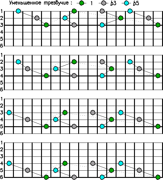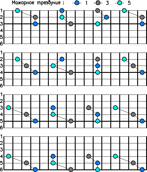 На практике чаще трезвучия строят на трех струнах, т.е. одна ступень - одна струна. Ниже приведены аппликатуры всех 4-х типов трезвучий с тоникой на 6-ой, 5-ой, 4-ой и 3-ей струнах: