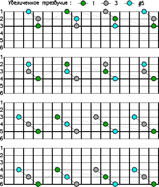Как видно из этих схем, Вам надо запомнить всего четыре аппликатуры по одной для каждого типа трезвучия. При игре на низких струнах, когда ни одна из ступеней не попадает на 2-ю и 1-ую струны, они применяются без изменения. Когда попадают на 2-ую или 2-ую и 1-ю - необходимо просто учитывать полутоновое смещение на этих струнах: