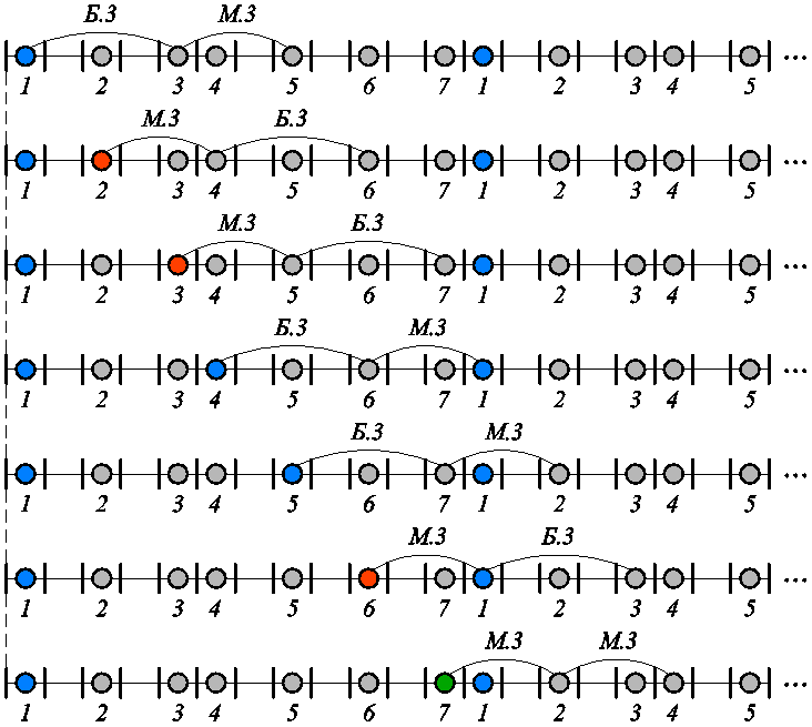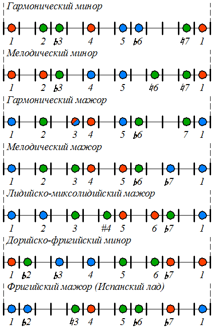 Помнить эту схему важно, так как она определяет не только типы трезвучий, которые можно построить от той или иной ступени натурального мажора, но и аккорды, септаккорды, пентатоники, диатонические лады. Ниже приведена подобная схема для наиболее распространенных условно-диатонических ладов (зеленым цветом