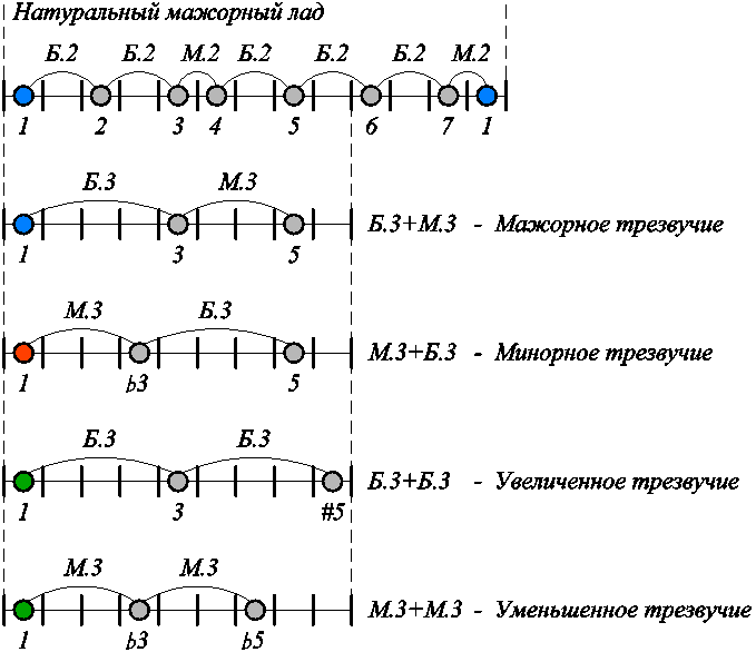 Еще один важный момент, который стоит отметить, - это типы трезвучий, которые можно построить от каждой ступени натурального мажорного лада. На следующей схеме это показано наглядно (если от ступени строится мажорное трезвучие, она отмечена синим