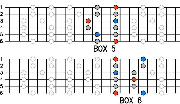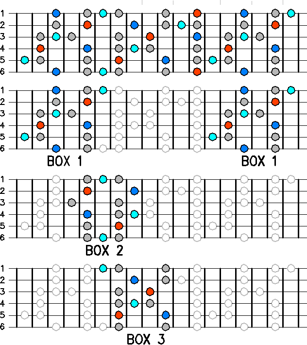 Боксов пентатоники пять типов, но пронумерованы они в соответствии с боксами натурального мажорного лада, а точнее, как и боксы натурального мажорного лада, в соответствии со ступенями натурального мажора, поэтому в пентатонике нет BOX_4 и BOX_7, как нет в мажорной пентатонике IV и VII ступеней относительно натурального мажорного лада. Такая нумерация удобна для запоминания аппликатур, а в игре - для перехода из бокса пентатоники в бокс натурального мажора и обратно. Для запоминания боксов пентатоники удобно пользоваться октавными позициями (см. раздел Интервалы). На примере боксов пентатоники октавные позиции просматриваются лучше всего, более того, октавные позиции получили свои номера от боксов пентатоники. Боксы пентатоники с блюзовой нотой. Пентатоника с блюзовой нотой - это пентатоника, в которой присутствует хроматическая
