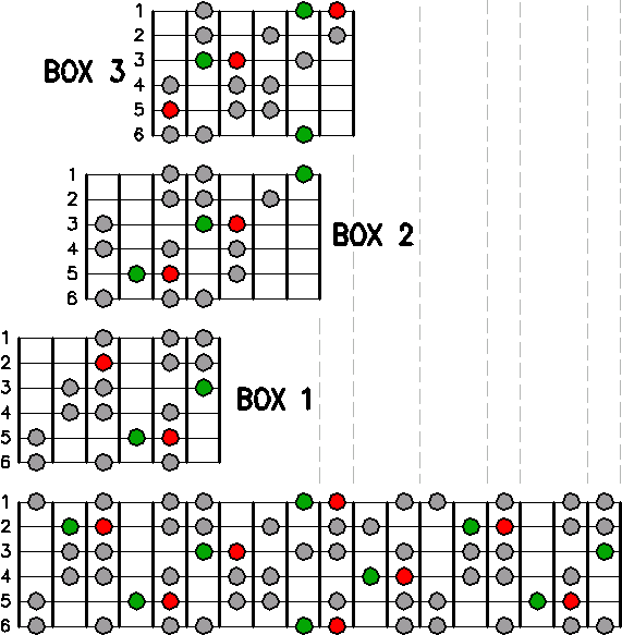Если нанести все ноты натурального мажора на гриф гитары, мы получим семь боксов, которые позволят играть данный звукоряд, а также параллельный ему натуральный минорный, в разных частях грифа.