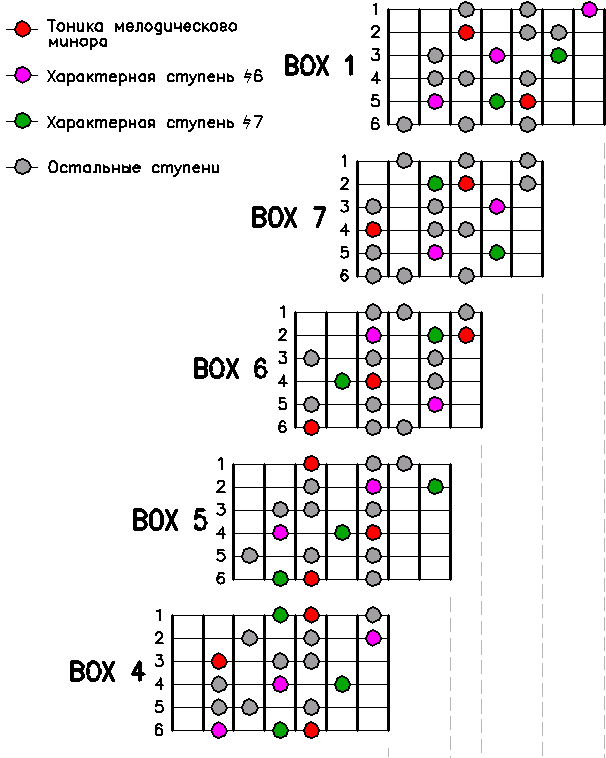 Изучая боксы гармонического минора, в первую очередь обращайте внимание на их отличие от соответствующих боксов натурального мажора. Боксы мелодического минора. Мелодический минор имеет следующую аппликатурную схему (с движением по одной струне):