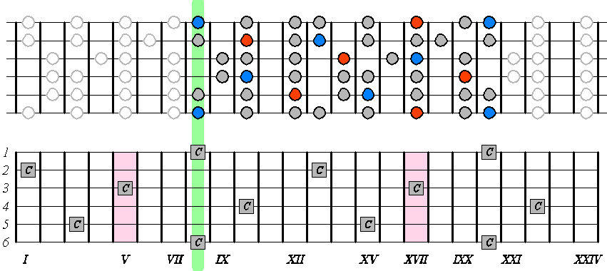 На рисунке выше номер бокса соответствует номеру ступени, от которой он строится. Синим цветом ( Боксы пронумерованы в соответствии со ступенями натурального мажорного лада, т.е. номер бокса - это та ступень натурального мажорного лада, которая "оказалась" первой нотой бокса на шестой струне. Структура боксов в рамках одной гаммы одинакова в независимости от тональности, а изменение тональности приводит просто к перемещению этой структуры (боксов) вдоль грифа. Ниже приведен пример, на котором показано, как определить положение боксов натуральной мажорной гаммы (и, соответственно, параллельной минорной) для той или иной тональности (в приведенных примерах для С-мажор, G-мажор и С-минор, G-минор).