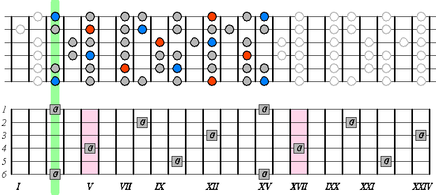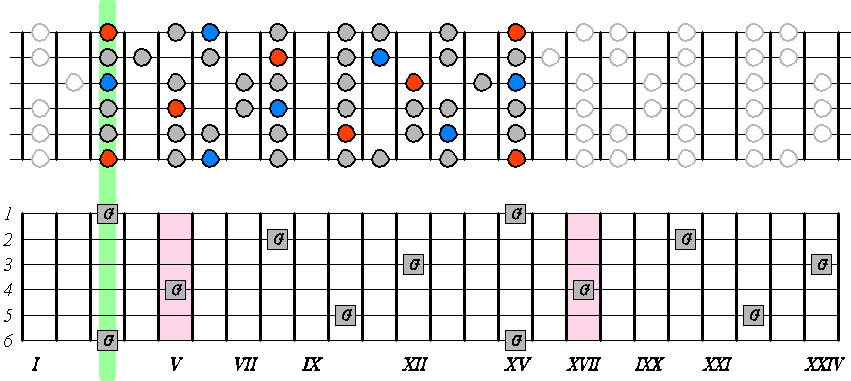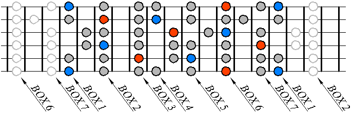 Стоит обратить внимание, что для перехода из мажора в параллельный минор и наоборот, боксы не перемещаются (расположение структуры на грифе одинаковое), изменяется акцент - или "синяя" нота (тоника мажора), или "красная" (тоника минора). Нумерация боксов - понятие довольно условное, и она необходима на первых порах изучения и запоминания. Здесь важна структура. Когда эти аппликатуры будут "в памяти" Ваших пальцев, Вы не будете думать, а в каком же боксе я играю, тем более что в игре, в импровизации, Вы ни как не ограничитесь одним боксом, а, играя вдоль всего грифа, будете постоянно переходить из одного бокса в другой. Поэтому изучая боксы, уделите особое внимание именно переходам из бокса в бокс. Удобно ассоциировать боксы с диатоническими ладами, построенными от 6-ой струны. Так, BOX_1 можно называть ионийским боксом, так как если принять за тонику его первую ноту на 6-ой струне, то получится ионийский лад. Аналогичным образом: BOX_2 - дорийский бокс, BOX_3 - фригийский бокс, BOX_4 - лидийский бокс, BOX_5 - миксолидийский бокс, BOX_6 - эолийский бокс, BOX_7 - локрийский бокс. Более наглядно это можно проиллюстрировать на следующем аппликатурно-схематическом примере: