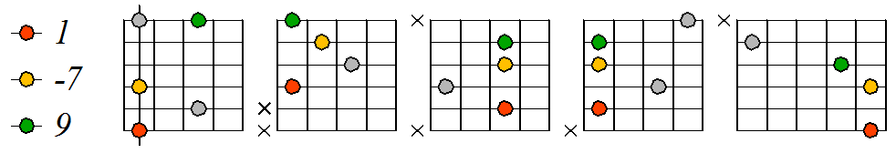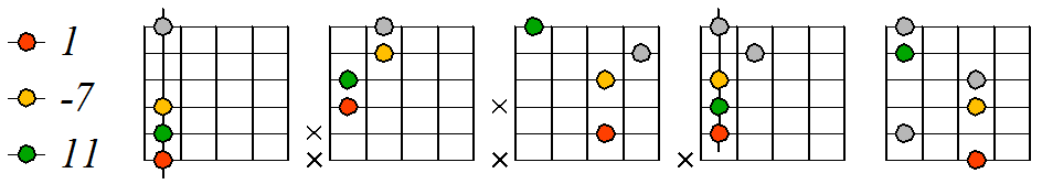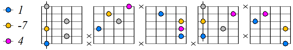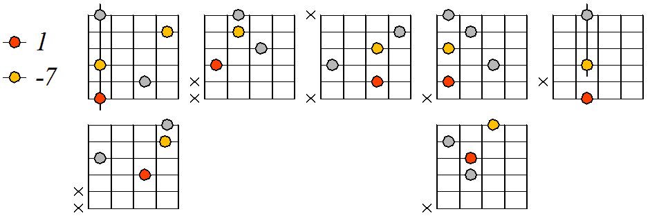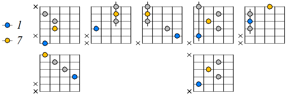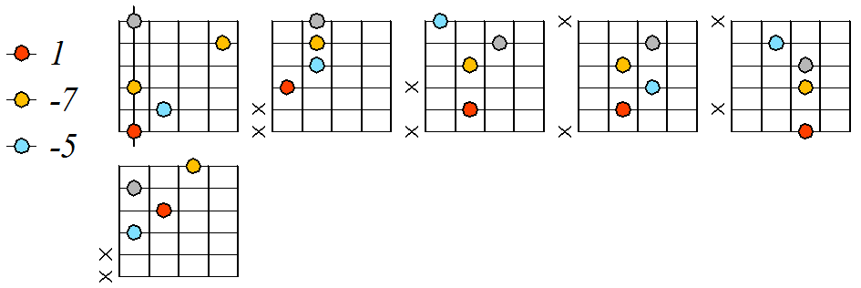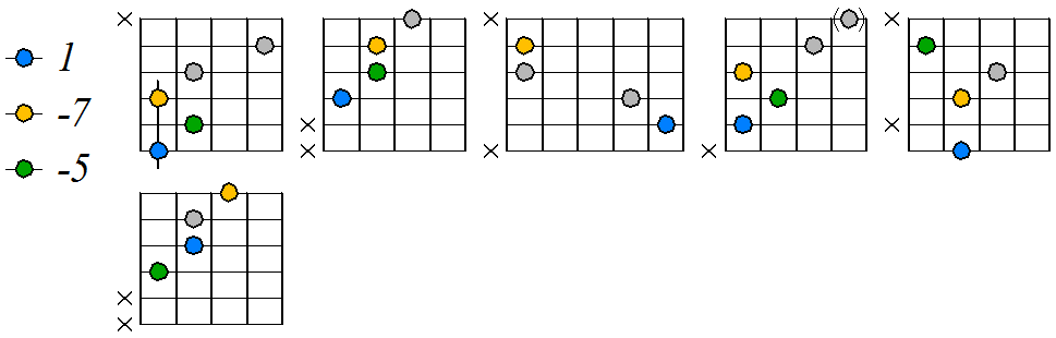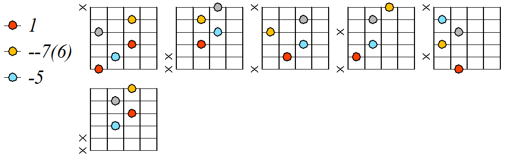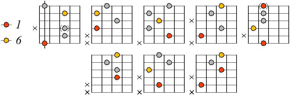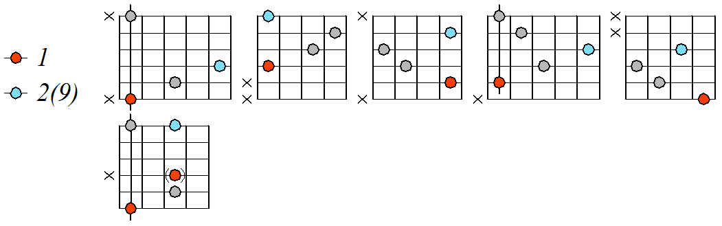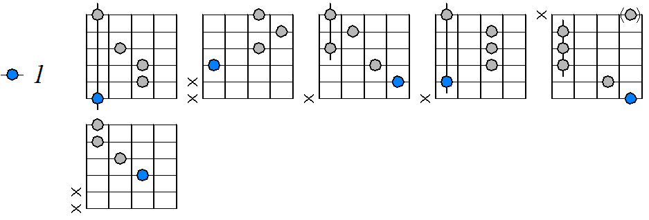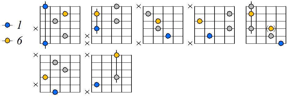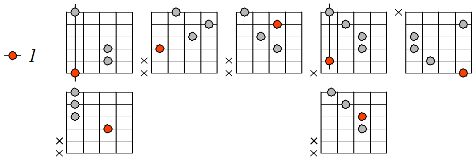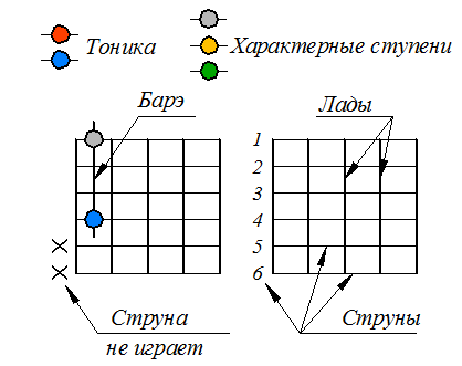 Основные аккорды... Для каждого аккорда приводятся несколько вариантов аппликатур, отличающихся положением нижнего тонического звука - на 6-ой, 5-ой или 4-ой струне, а также альтернативной комбинацией нот. Для того чтобы пользоваться этими схемами, необходимо знать расположение нот на грифе гитары, так как для построения, например, аккорда F с нижним тоническим звуком на 6-ой струне, необходимо найти ноту F на 6-ой струне и взять аппликатуру этого аккорда с нижним тоническим звуком на 6-ой струне. Для каждого типа аккорда необходимо знать как минимум 3 аппликатуры с тоникой на 3-х нижних струнах (6-ой, 5-ой и 4-ой). Условно-графическое обозначение аккордов В данном разделе принято следующее условно-графическое обозначение аккордов: