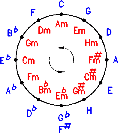Квинтовый круг... Квинтовый круг (кварто-квинтовый круг тональностей) - это схематическое, наглядное изображение (чаще всего в виде окружности) последовательности тональностей, отражающее степень их родства, ладовую функцию, гармонические обороты. На внешней стороне квинтового круга расположены мажорные тональности, параллельные минорные тональности (на малую терцию ниже) - на внутренней. На квинтовом круге тональностей (или кварто-квинтовом круге) основаны стандартные последовательности аккордов. Выбрав на внешней стороне круга любой аккорд и приняв его за тонику, легко узнать, какие еще аккорды входят в выбранную тональность.