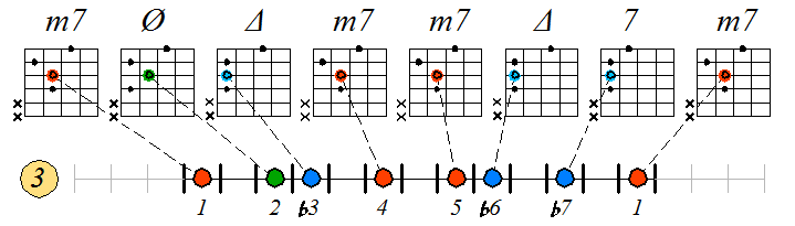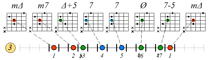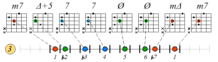 Игра гаммы дорийско-фригийского минора септаккордами с движением тонических нот по 3 струне: