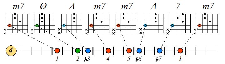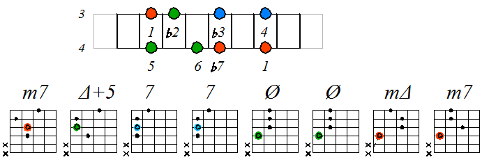 Игра гаммы дорийско-фригийского минора септаккордами с движением нижних тонических нот по 4 струне: