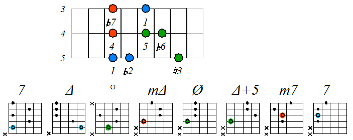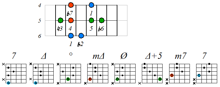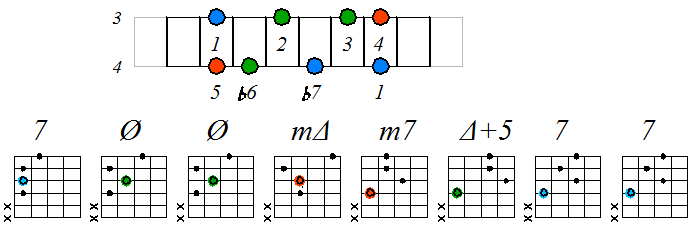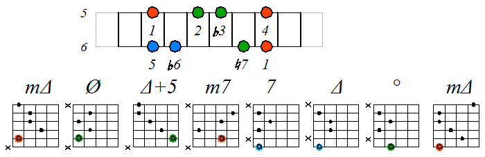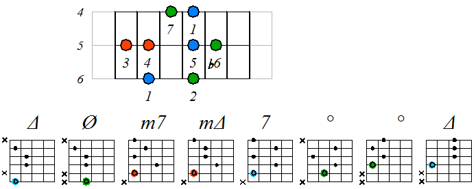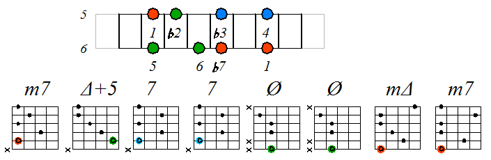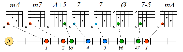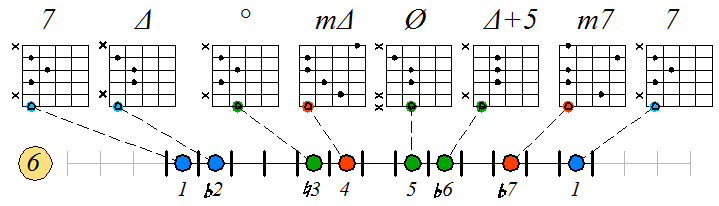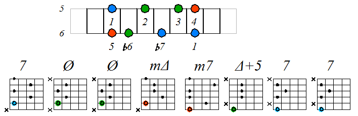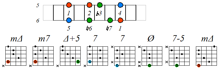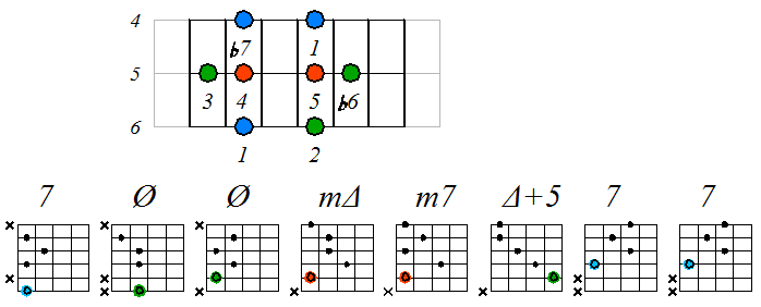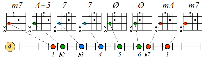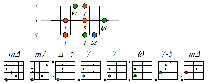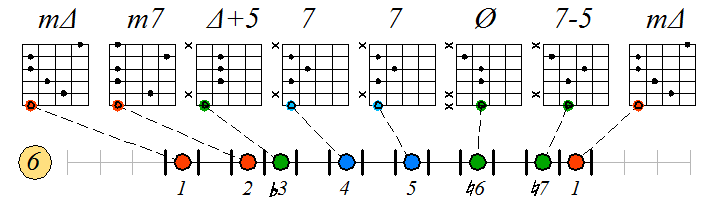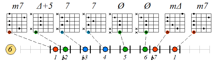 Ниже приведен пример игры гаммы мелодического минора септаккордами с движением нижних тонических нот по 6 струне с переходом на 5 и 4: