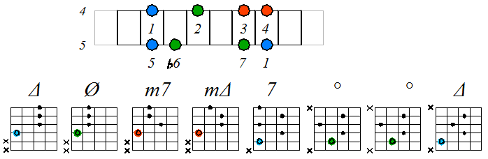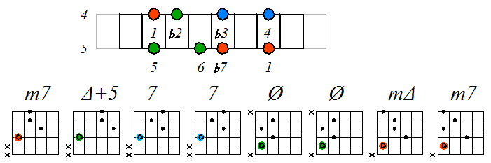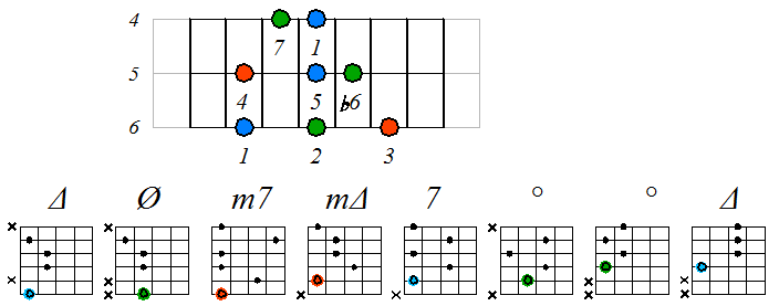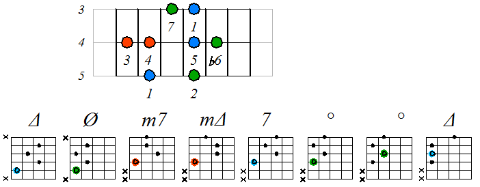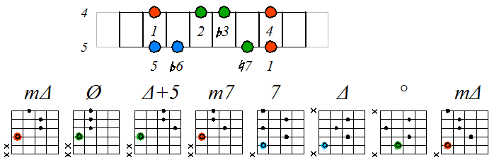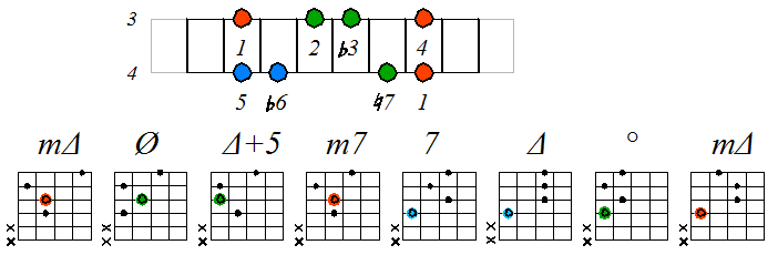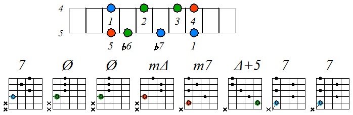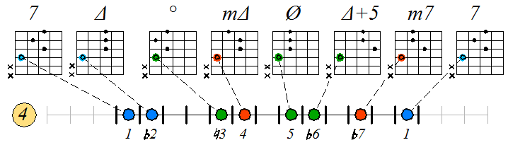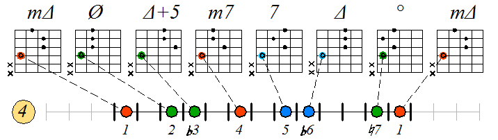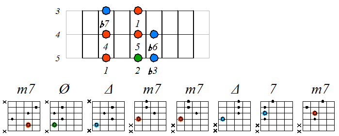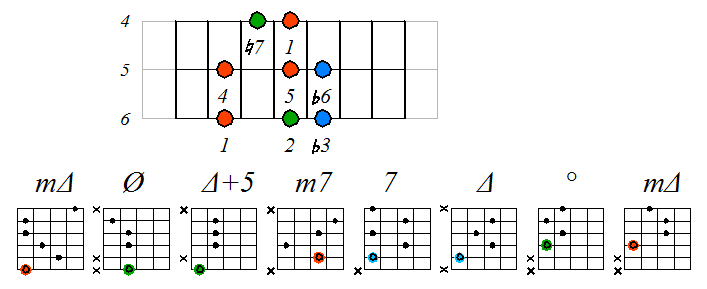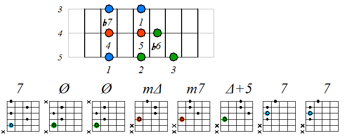Как видно, на каждой струне играются по четыре септаккорда, а перход на нижнюю струну происходит с пятой ступени гаммы. Эти два правила будут справедливы и далее. Приведенные выше примеры обыгрывания гамм, следует проработать во всех тональностях с использованием различных вариантов аппликатур аккордов. Ниже будут приведены варианты игры септаккордами, построенными на ступенях условно-диатонических ладов. Натуральный минор На ступенях гаммы строятся следующие септаккорды: