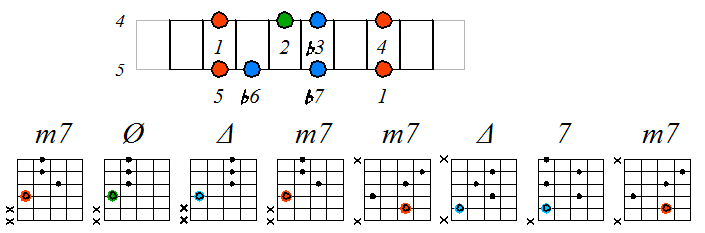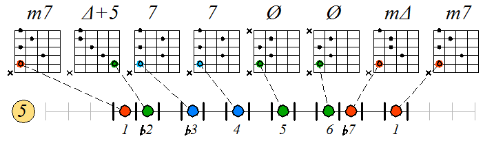 Игра гаммы дорийско-фригийского минора септаккордами с движением тонических нот по 5 струне с переходом на 4 и 3: