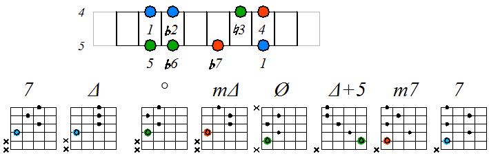 Игра гаммы гармонического мажора септаккордами с движением нижних тонических нот по 5 струне с переходом на 4 и 3 (альтернативная аппликатура гаммы):