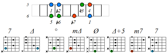 Игра гаммы фригийского мажора септаккордами с движением нижних тонических нот по 5 струне: