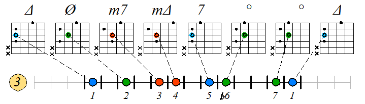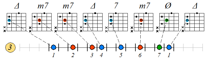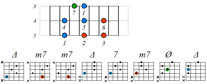 Игра натурального мажора септаккордами с движением тонических нот по 3-ей струне: