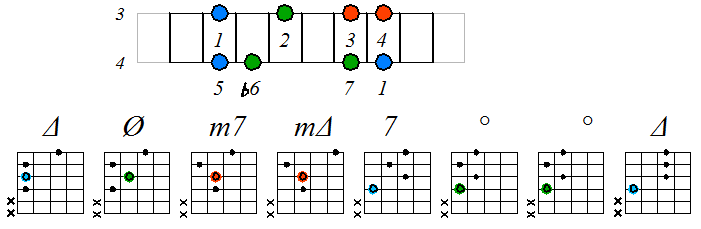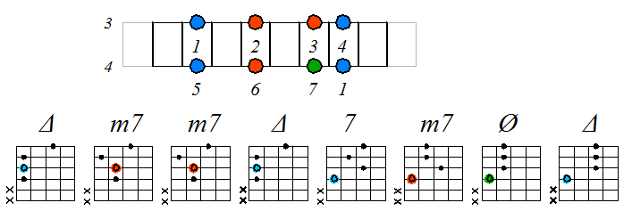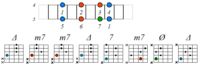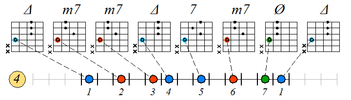 Игра натурального мажора септаккордами с движением нижних тонических нот по 4-ой струне: