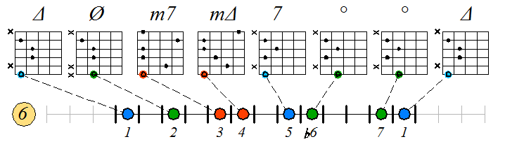 (см. обозначение ступеневых оборотов) Игра натурального мажора септаккордами с движением нижних тонических нот по 6-ой струне: